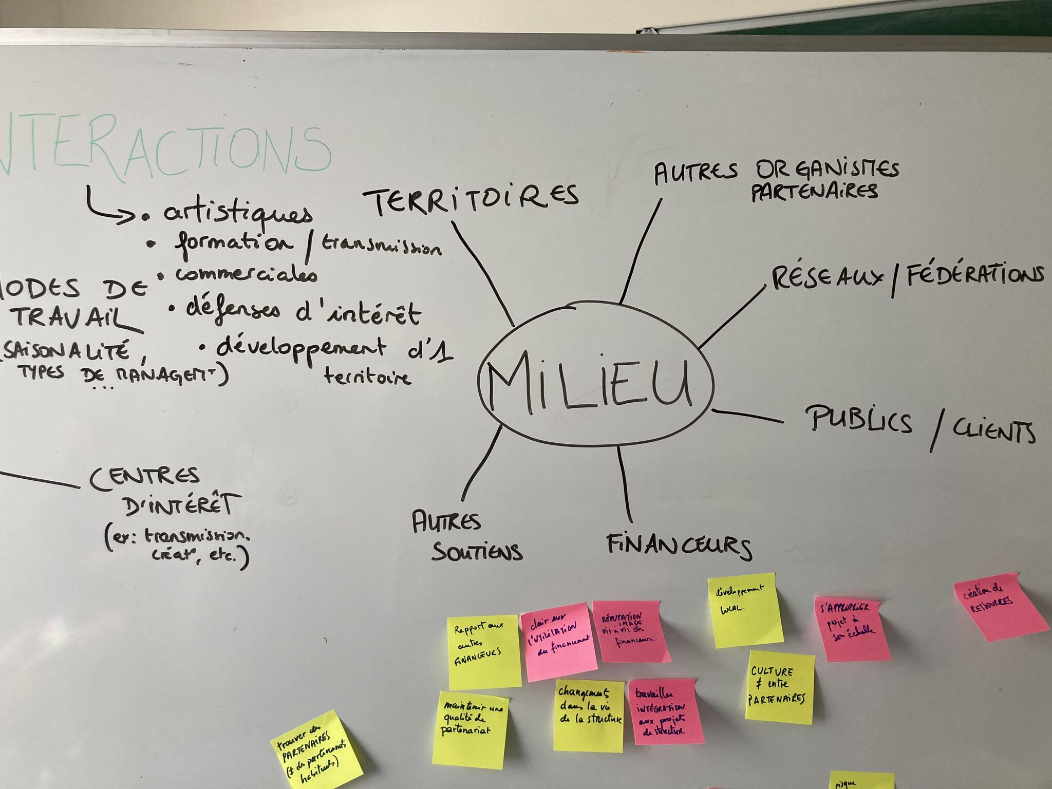 entre l'organisme et son milieu nous avons identifié les interactions suivantes: artistiques, formation et transmission, commerciales, défenses d'intérêts, développement d'un territoire.